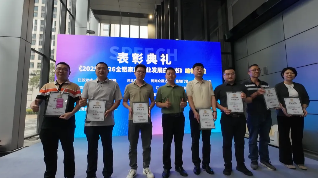 白皮书的编纂离不开行业内众多实力企业的积极参与和智力贡献。为表彰这些为行业知识库建设做出卓越贡献的单位,大会特设了庄重而盛大的“编委单位表彰典礼”。颁奖典礼分三轮进行,近百家企业荣膺“《2025-2026全铝家居行业发展白皮书》编委单位”称号。重庆市西南铝实业有限公司、山东华铝家居科技股份有限公司、佛山左邻五金科技有限公司等来自全国各地的优秀企业代表依次上台,从颁奖嘉宾周赞恩会长、何福新秘书长、王小锋秘书长手中接过荣誉奖牌。这一环节不仅是对获奖企业专业贡献的肯定,更是全产业链团结协作、共谋发展的生动体现。