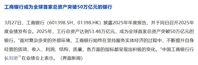 截至2025年末,工行总资产达53.48万亿元,同比增长9.5%,成为全球首家资产突破50万亿元的商业银行,规模壁垒无可撼动。