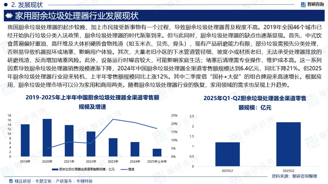 发展现状:中国厨余垃圾处理器的起步较晚,加上市民接受新事物有一个过程,导致厨余垃圾处理器普及程度不高。2019年全国46个城市已经开始执行垃圾分类入法政策,厨余垃圾处理器的时代渐渐到来。但与此同时,厨余垃圾处理器的缺点也逐渐显现,导致行业销售规模逐渐下降,2024年中国厨余垃圾处理器全渠道零售额规模达到6.4亿元,同比下降21%。但2025年厨余垃圾处理器行业迎来转机,上半年零售额规模同比上涨12%。其中二季度借“国补+大促”的组合牌迎来高速增长。根据应用,厨余垃圾处理市场可以分为家用和商用两类。随着厨余垃圾处理器行业的恢复,家用领域的需求也呈现上升趋势。