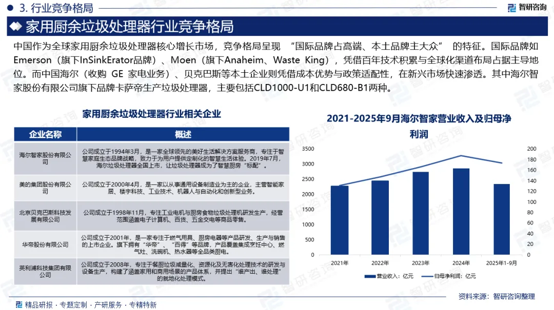企业格局:中国作为全球家用厨余垃圾处理器核心增长市场,竞争格局呈现 “国际品牌占高端、本土品牌主大众” 的特征。国际品牌如Emerson(旗下InSinkErator品牌)、Moen(旗下Anaheim、Waste King),凭借百年技术积累与全球化渠道布局占据主导地位。而中国海尔(收购 GE 家电业务)、贝克巴斯等本土企业则凭借成本优势与政策适配性,在新兴市场快速渗透。