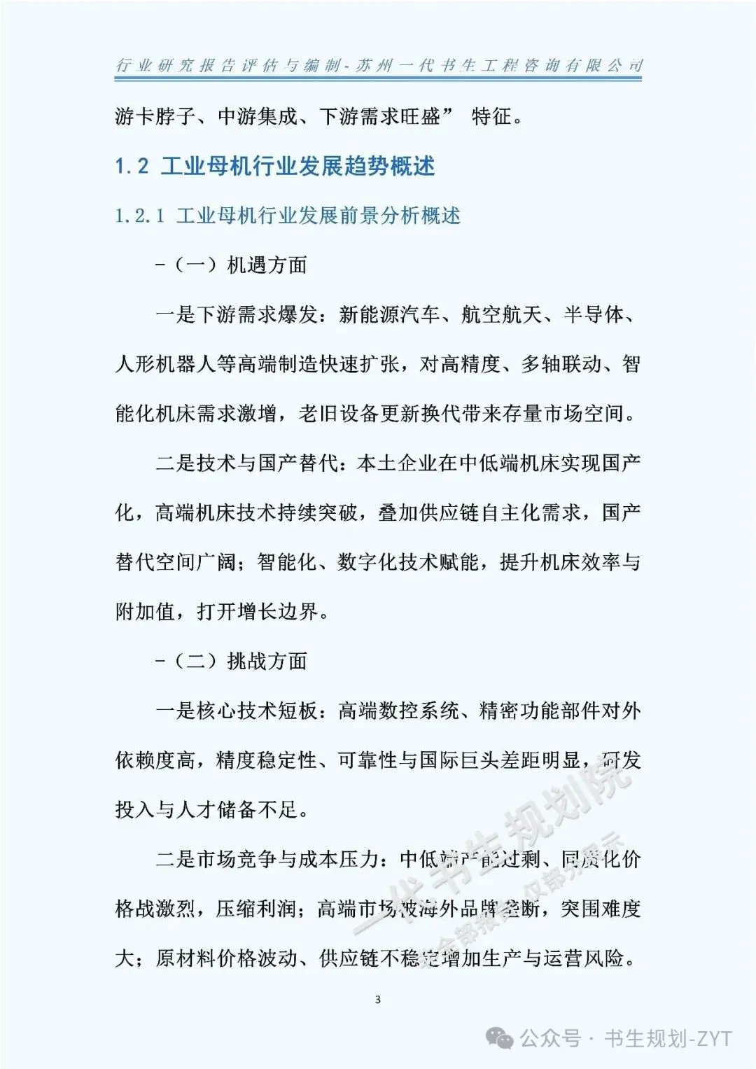 行业趋势方面,随着制造业智能化转型加速,工业母机机床向高精度、高速度、复合化方向发展,五轴联动、智能控制系统等技术应用比例将显著提升,同时绿色制造理念推动节能型机床需求增长,行业整体呈现技术密集化与产品高端化的发展态势。