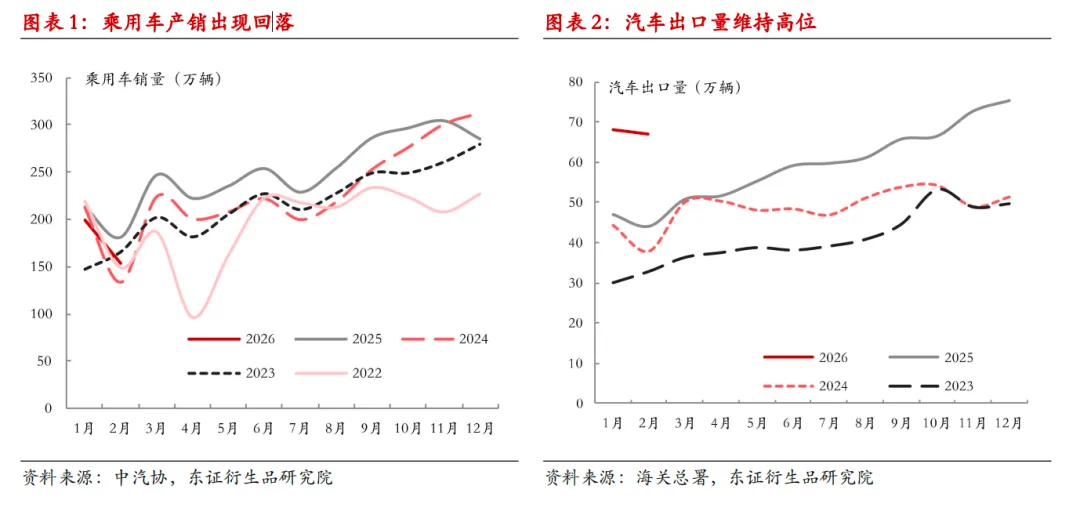 此外,市场对于2026年的需求预期相对比较模糊。在建材需求的回落压力也有所缓和的情况下,制造业和外需的状况成为更加重要的变量。从1-2月统计局产销数据看,汽车、家电的产销情况都不算乐观,尤其是内需随着国补的退坡,有不同程度的下滑。在内需缺乏亮点的同时,制造业出口依然呈现相当强劲的格局。随着地缘冲突的加剧,制造业需求能否继续支撑钢材需求的韧性,以及需求是否存在预期差也是我们希望通过终端调研了解的主要问题。