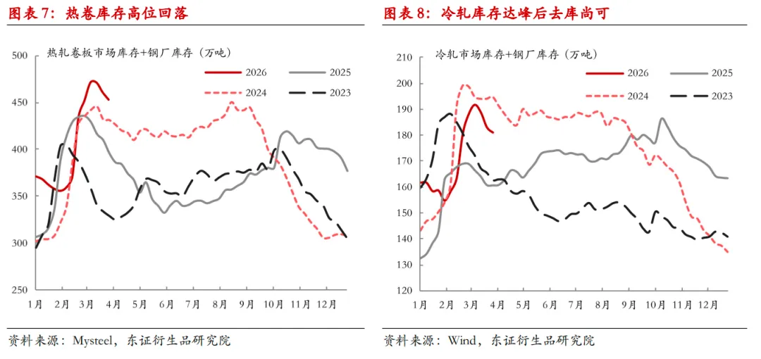 从节奏上看,目前钢价一方面受到能源和铁矿价格波动的影响,4月份中东局势的变化是非常重要的影响变量。另外,从产业端的反馈看,近期钢厂由于抢欧美出口配额等因素,卷板资源的市场投放相对有限,也导致了市场资源相对偏紧。而若二季度中后期制造业同样进入需求淡季,去库速度的持续性也有待观察。在成本推动钢价进入估值偏高区间后,仍需警惕价格的回调风险。