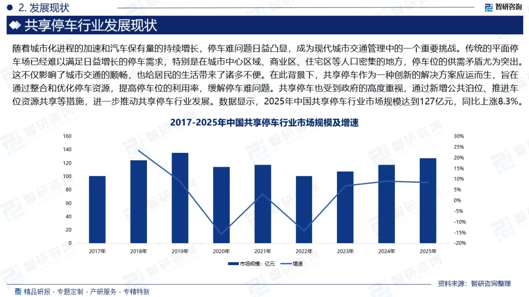 市场规模:随着城市化进程的加速和汽车保有量的持续增长,停车难问题日益凸显,成为现代城市交通管理中的一个重要挑战。传统的平面停车场已经难以满足日益增长的停车需求,特别是在城市中心区域、商业区、住宅区等人口密集的地方,停车位的供需矛盾尤为突出。这不仅影响了城市交通的顺畅,也给居民的生活带来了诸多不便。在此背景下,共享停车作为一种创新的解决方案应运而生,旨在通过整合和优化停车资源,提高停车位的利用率,缓解停车难问题。共享停车也受到政府的高度重视,通过新增公共泊位、推进车位资源共享等措施,进一步推动共享停车行业发展。数据显示,2025年中国共享停车行业市场规模达到127亿元,同比上涨8.3%。