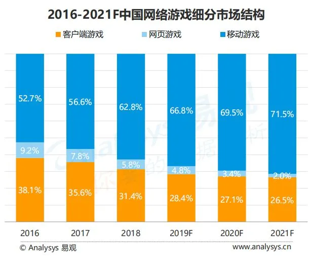 报告显示,截至2018年,手游在中国网络游戏中的市场份额已首次超过六成,端游则被压缩到三成左右。易观预测,到2021年,手游在整个市场中的所占比例将达71.5%,而逐渐式微的页游届时只有2%左右的市场份额,端游将长期陷于供需矛盾中。