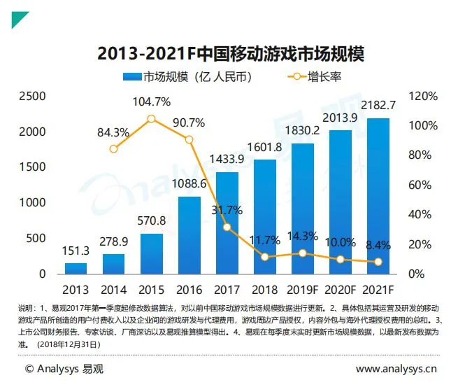 受政策调整等因素影响,2018年移动游戏市场增速显著放缓,由2017年的31.7%的增速降至11.7%,预计到2021年时,市场增速将跌破两位数。此外,手游行业还面临着用户增量红利消亡、资本信心不足、头部效应持续增强等更加深层次的问题,过去依靠用户增量红利的增长模式无法持续,行业需要在存量市场中,打造具备文化和产业双重价值的产品,寻找新的增长模式。