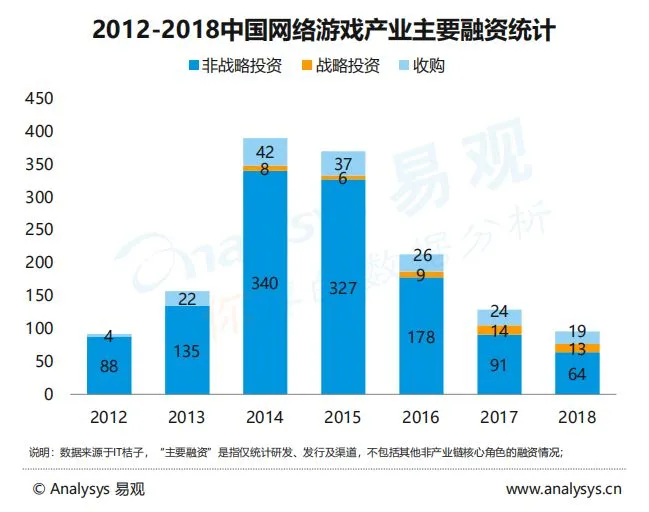 报告还统计了近几年游戏产业的融资情况,数据表明,2018年中国网络游戏产业的主要融资(仅包括研发、发行和渠道)总数为93起,已不足2014年巅峰时期的1/4。报告指出,随着用户红利的消失,厂商产品内容能力不足的问题逐渐暴露,这也令游戏行业的投资价值随之降低。在头部厂商的竞争优势不断增强的市场环境下,资本市场也更加注重对具有成熟产品经验和资源的厂商的投资,此外,2014及2015年两年间高达79起的收购事件不仅体现了当时的资本火热情况,也为此前大量上市公司商誉爆雷埋下了种子。