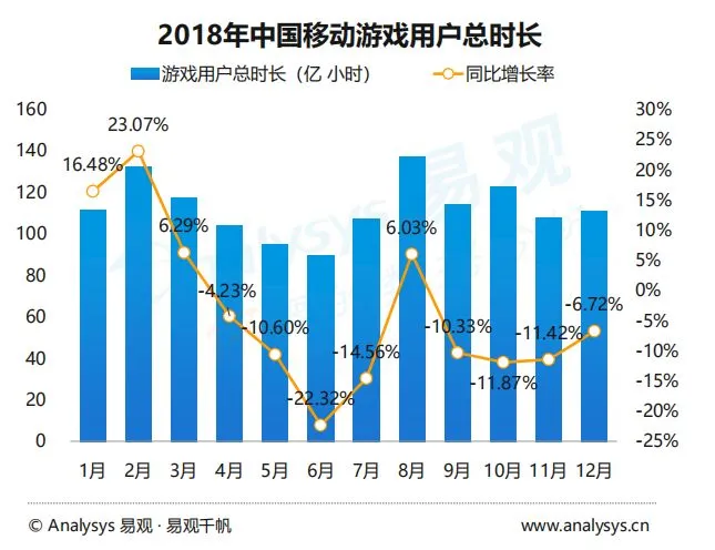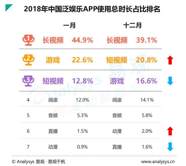 对比2018年1月和12月的泛娱乐App使用时长可以看到,游戏类App的总时长从年初的22.6%下降到了年末的16.6%,排名也被短视频反超,从第二滑落到了第三。不过,易观也同时指出,其他娱乐方式的崛起为移动游戏在推广媒介、IP培育和运营等方面提供了更多的机会。