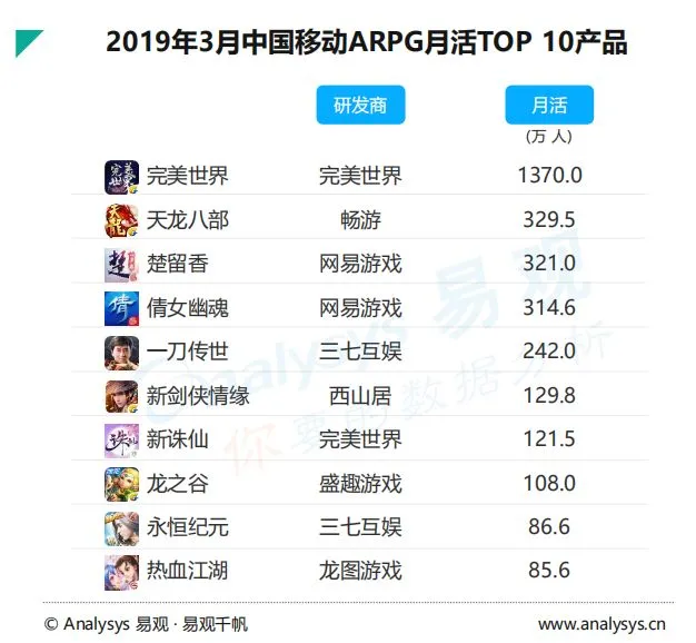 从2018年的整体趋势来看,ARPG这个十分成熟的细分市场的月活情况一直呈下滑趋势,使其在2019年得以改观的是《完美世界》的上线。数据显示,《完美世界》今年3月单月月活达1370万,高居榜首。相较之下,《天龙八部》、《楚留香》、《倩女幽魂》等其他位列前5的产品月活为300万左右。在ARPG这个品类中,《完美世界》表现出了明显的统治力。