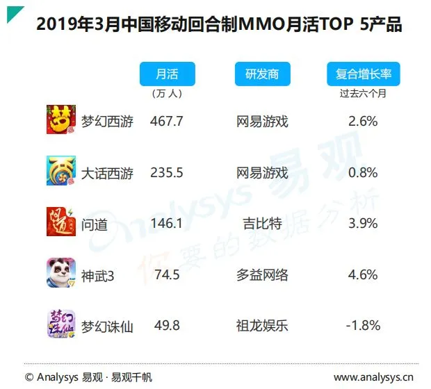 回合制MMO是产品生命周期较长且表现比较稳定的一个品类,但这些传统IP、老产品对新生代玩家的吸引力却不尽如人意。数据显示,前5的几款头部产品占据了此品类八成以上的用户,在大量新品接连折戟之后,由于IP资源的消耗,厂商对回合制MMO新品的投入将不断收缩,回合制MMO市场可能会迎来后继无人的状况,对此,易观的这份报告期待这种战斗模式能在CCG、SLG等品类中得到持续的挖掘、融合与发扬。