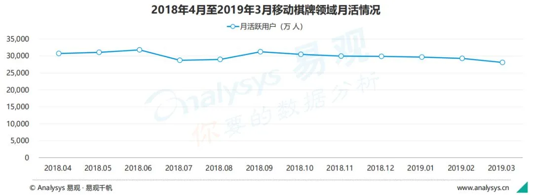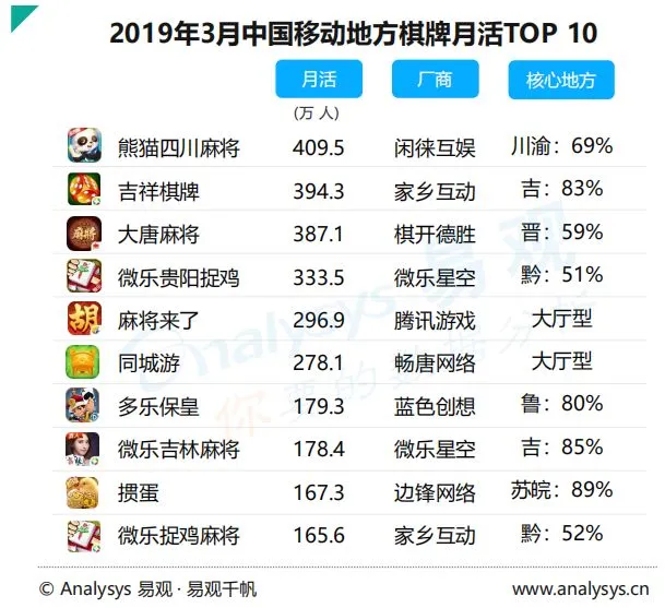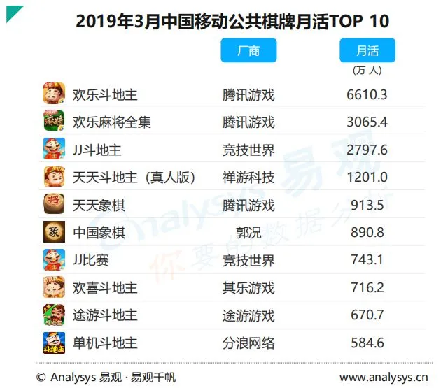 总体而言,在监管趋严的环境下,移动棋牌游戏的月活数据仍然保持稳定,可见用户对于此类游戏的需求依旧存在,囿于新产品供应短期内无法开放,厂商只能继续在现存产品中发掘增长空间。数据显示,棋牌游戏拥有各品类中最大的用户基本盘——3亿,因此腾讯游戏旗下的两款头部产品《欢乐斗地主》和《欢乐麻将全集》尽管占有一定的领先优势,但不足以对其他产品形成压制。对于棋牌游戏的未来走势,易观持谨慎态度,他们认为无论监管是否放开棋牌游戏版号,公共棋牌市场的存量化也已经大局已定,现有厂商难以为市场带来新的元素,公共棋牌市场未来的想象空间,主要在于激励及流量变现模式在下沉市场的拓展与海外市场。