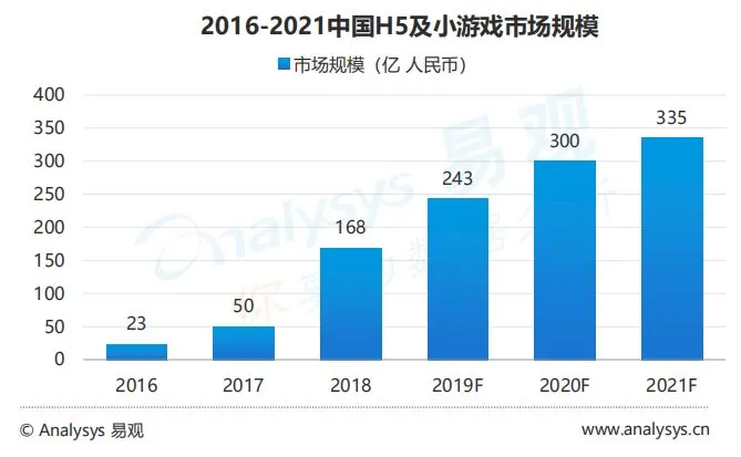 在中国游戏市场整体增速放缓的背景下,H5及小游戏却迎来了超过200%的超高增速,由2017年50亿元增长至2018年的168亿元,到2021年,易观预测该品类的市场规模将超过300亿元。H5游戏相比小游戏更为重度,也有更深的拓展空间及更好的用户粘性,未来还有相当的潜力。对于H5及小游戏的发展趋势,报告预测: