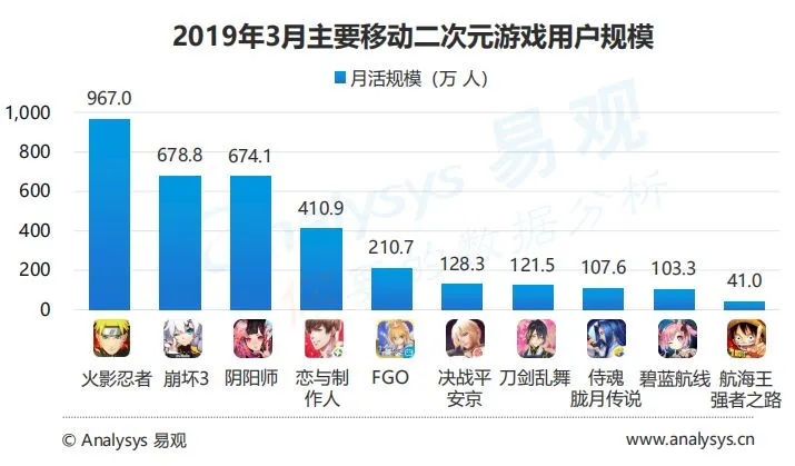 报告认为,二次元游戏是对厂商的产品能力考验最严格的市场,自2018年起换皮“伪二次元游戏”已经无法得到用户的信任,而以《崩坏3》、《阴阳师》、《F/GO》等为代表的优质产品仍保持着较强的生命力。用户规模方面,头部日漫IP产品《火影忍者》以967万月活独占鳌头,《刀剑乱舞》、《航海王强者之路》也有不俗表现。报告预测: