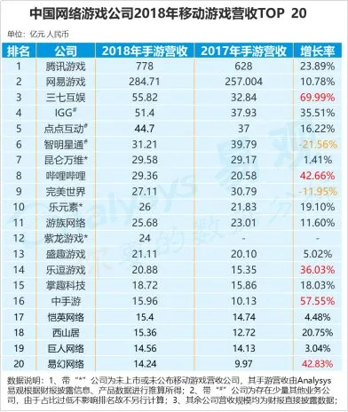 下附中国网络游戏公司2018年手游营收TOP20: