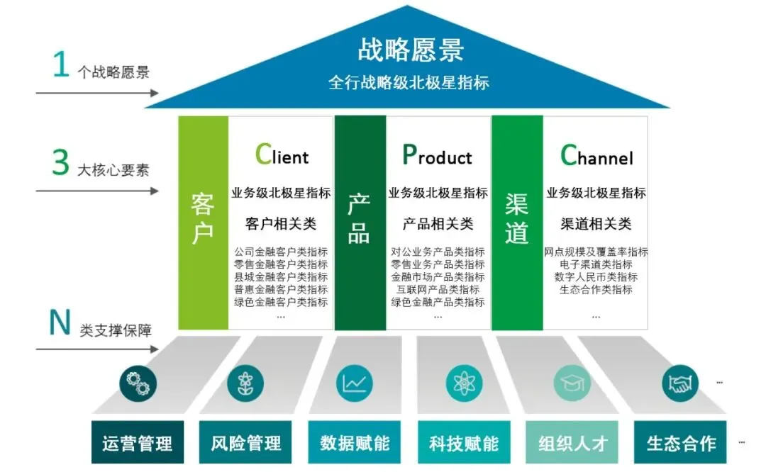 最核心的当然是我们为中小银行量身打造的“1+3+N”中小银行价值管理框架。它从1个战略愿景出发,沿袭第四张报表价值管理三要素,即客户、产品、渠道,并关注中后台对战略及业务目标实现的支撑保障,尤其是运营、风控、组织人才、数据及科技赋能等。