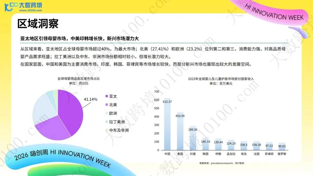 重点品类: 婴儿护理(2023年全球规模992.6亿美元):洗护产品占67%,护肤品类增速领先; 孕产妇护理:支撑类产品2023年规模达337亿美元,高端化、个性化需求释放; 智能母婴用品:AI哭声识别、智能温奶器、监护垫等设备渗透率达30% 。 目标市场: 东南亚:人口红利+电商渗透率提升,适合性价比与社交驱动型品牌; 中东非、拉美:潜力突出,对高性价比国货接受度高; 欧美:需强化品牌专业形象与合规认证,适合高端有机、功能型产品切入。