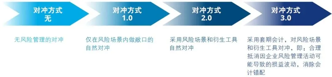 套期会计(对冲方式3.0)是会计准则体系中较为特殊的一种会计处理方法。企业可以选择采用或不采用套期会计核算。若采用该准则,它允许企业在满足一定前提条件下,将套期工具的公允价值或现金流量变动抵销被套期项目全部或部分公允价值或现金流量变动风险,使得企业受套期业务相关的损益影响或者其他综合收益波动降低,会计核算结果更好地反映风险管理实务。