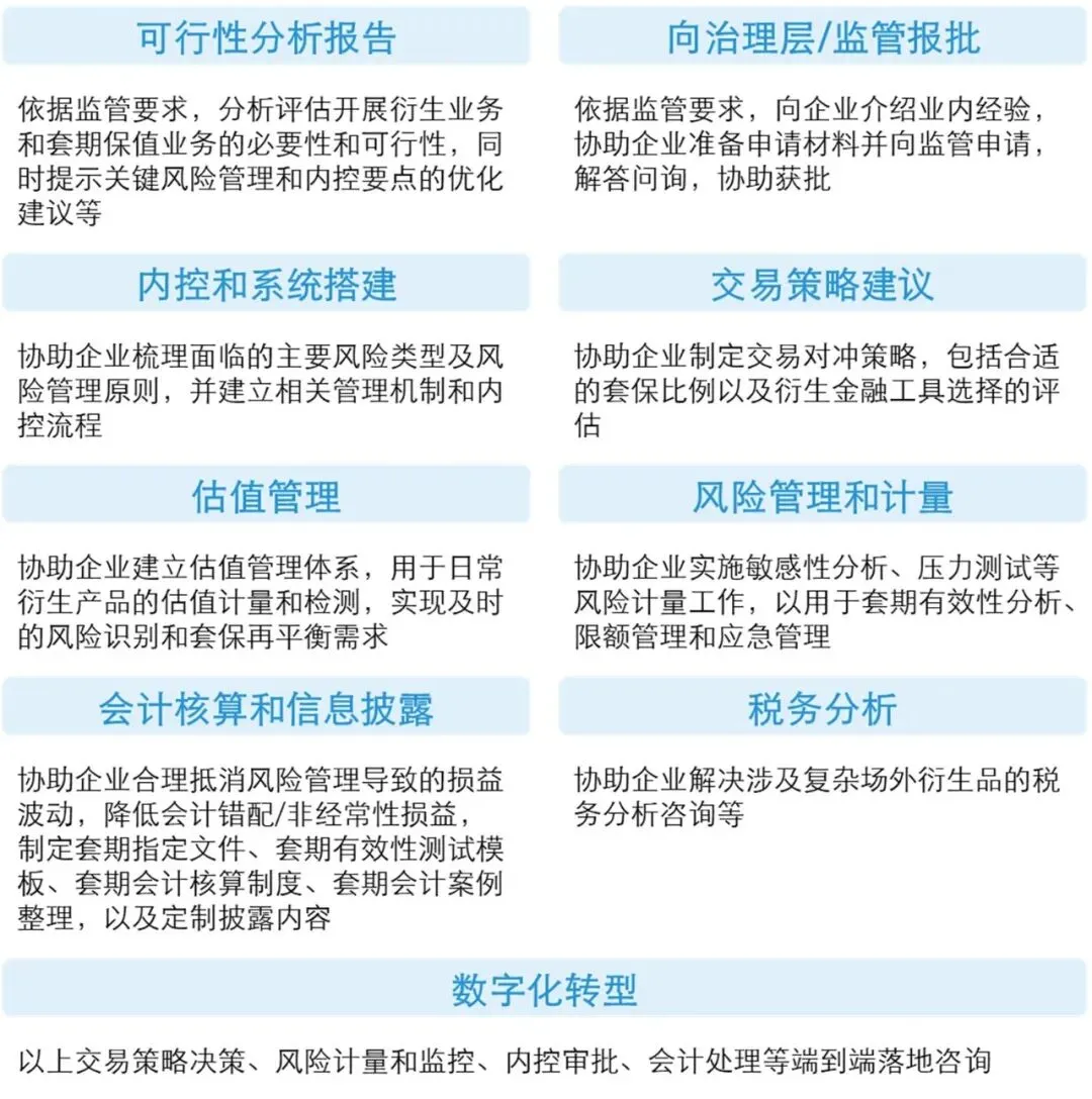 越来越多的证券公司、期货公司等金融机构在向产业客户提供衍生品套期保值服务时,已经不仅仅是开户等经纪业务,或是产品或者交易维度的交易咨询顾问。为了能够切实帮助企业实体有效地管理生产经营及投融资过程中面临的风险,尽可能地降低市场变化对实体企业带来的负面效应,从而使企业更加专注于主营业务,证券公司和期货公司会联合其他中介专业机构一并向企业提供综合服务。特别是有衍生品需求的上市公司、国企或央企对场外衍生品的综合服务水平有着更高的要求,证券公司和期货公司更是需要联合其他中介服务机构,以满足更严格的内控合规和信息披露要求。例如实务中,企业在接触衍生品推介时,可能会有关于套期保值可行性研究报告或套期保值公告、衍生品和套期保值相关的风险管理、组织架构和业务流程制度、套期会计咨询以及税务等方面的咨询需求。