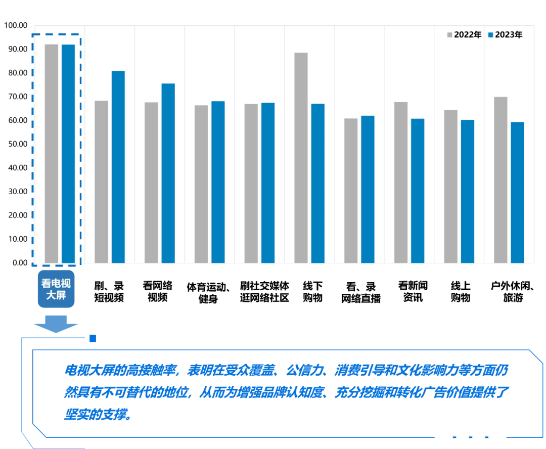 美兰德传播咨询联合大屏聚宝盆共同推出《2023-2024 IPTV大屏行业白皮书》。白皮书不仅是对当前IPTV大屏行业的一次全面梳理,更是对未来发展趋势的一次深刻预见。在数字化浪潮席卷全球的今天,IPTV作为电视大屏发展的重要渠道,坐拥最庞大的电视家庭用户,正以其独特的优势,引领着家庭娱乐方式的革新。白皮书以详实的数据、深入的分析,全面展现了IPTV大屏行业的市场现状和营销格局。同时,结合行业趋势和市场需求,白皮书还对IPTV大屏行业的未来发展进行了前瞻性预测,为行业参与者提供决策参考。当前大屏营销价值持续释放,IPTV作为大屏营销核心价值高地的地位日益凸显。大屏智能化正在突破传统传媒的界限,引发整个行业生态的变革,IPTV无论在用户规模、传播效能,还是营销价值上,均处在黄金期。白皮书深入探讨大屏营销价值,剖析IPTV在营销领域的核心地位和发展趋势。在数字经济、“宅经济”加速发展背景下,电视大屏作为最重要的信息传递媒介和优质内容传播平台,始终保持着对全年龄受众的强大吸引力,以自身优质的内容矩阵、及时发布的权威信息、独特的客厅属性等诸多优势集合,仍然在文娱消费领域中占据着重要地位。2022-2023年全国居民对各类媒介及文娱项目接触率TOP10(%)数据来源:美兰德·中国居民媒介接触习惯与生活消费形态调查数据库 Source:2022-2023.9@CMMR Co.,Ltd, 调查范围为全国31个省、直辖市、自治区,调查对象为调查范围内的常住人口,2023年调查样本量为12344人。在短视频传播发展势头迅猛的今天,通过电视大屏观看节目依然是居民媒介使用的最优选择,与短视频小屏碎片化传播不同,电视大屏节目以高质量的画质、专业的制作带给人们沉浸式的享受。电视大屏以“户”为单位的传播形态使其拥有更广泛的触达面、更强的影响力、更高的用户粘性,在相同的时空中可以吸引更多受众的关注。在媒介接触选择上,通过电视大屏观看节目仍然是居民接触媒介最主流的方式,独特的媒介优势更好地抓住了居民的注意力,电视大屏同居民日常生活联系紧密,即使在快节奏的当下每日依然可以保持相当可观的使用时长。数据来源:美兰德·中国居民媒介接触习惯与生活消费形态调查数据库 Source:2022-2023.9@CMMR Co.,Ltd, 调查范围为全国31个省、直辖市、自治区,调查对象为调查范围内的常住人口,2023年调查样本量为12344人。