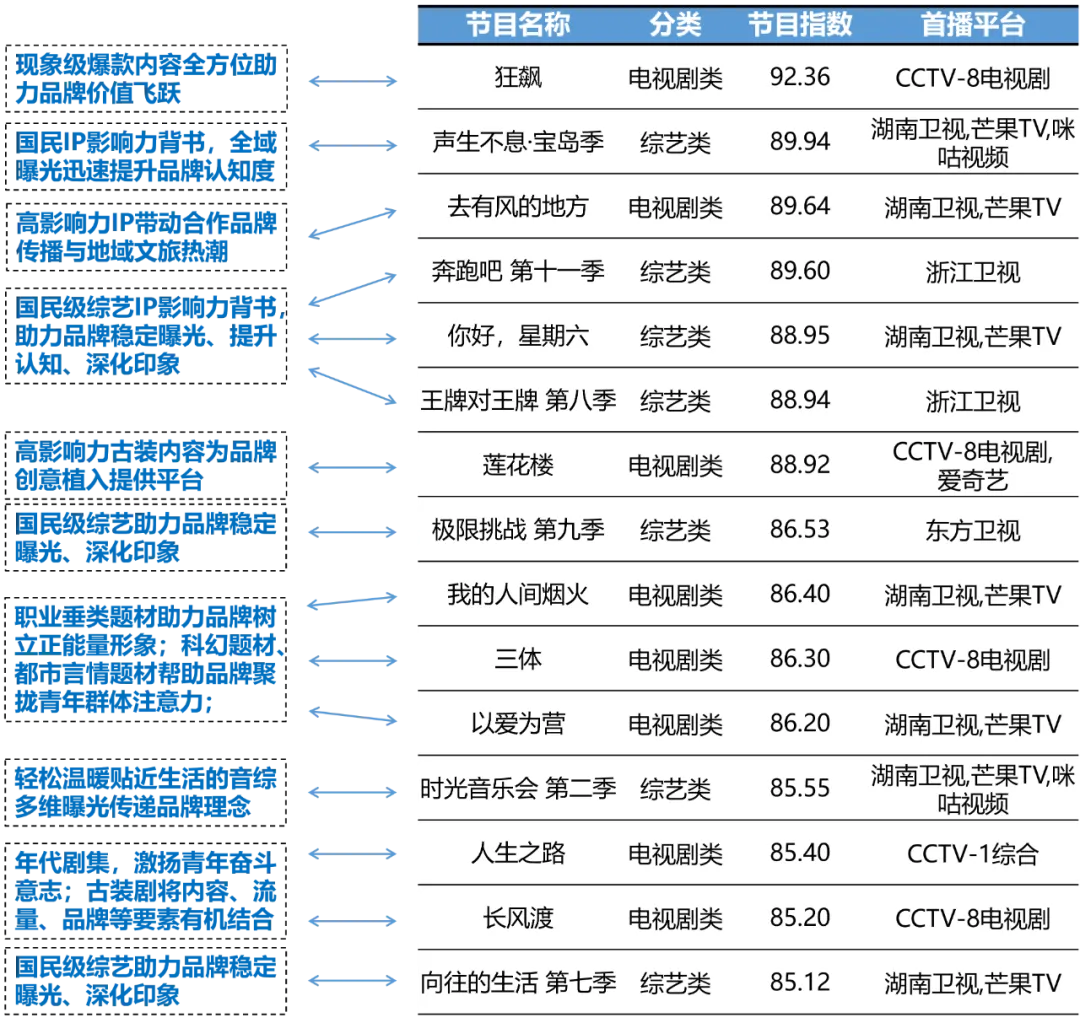随着技术不断发展,除直播、点播、回看等基础功能外,电视大屏承载的功能和内容形态更加智能、丰富,展现出智慧化、精准化等发展趋势。电视大屏内容的正向价值与全龄人群的高适配度能够持续为品牌形象背书,从而实现品牌在电视大屏端从“认识”到“认可”的价值飞跃。电视大屏内容有严格的审核把关流程,在内容质量上具有稳定保障。电视大屏内容在优质化、精品化道路上不断升级,能充分满足受众日益增长的精神文化需求。2023年电视大屏在播节目网络影响力综合指数TOP15数据来源:美兰德·视频网络传播监测与研究数据库 Source:2023.1.1-2023.12.31@CMMR Co.Ltd