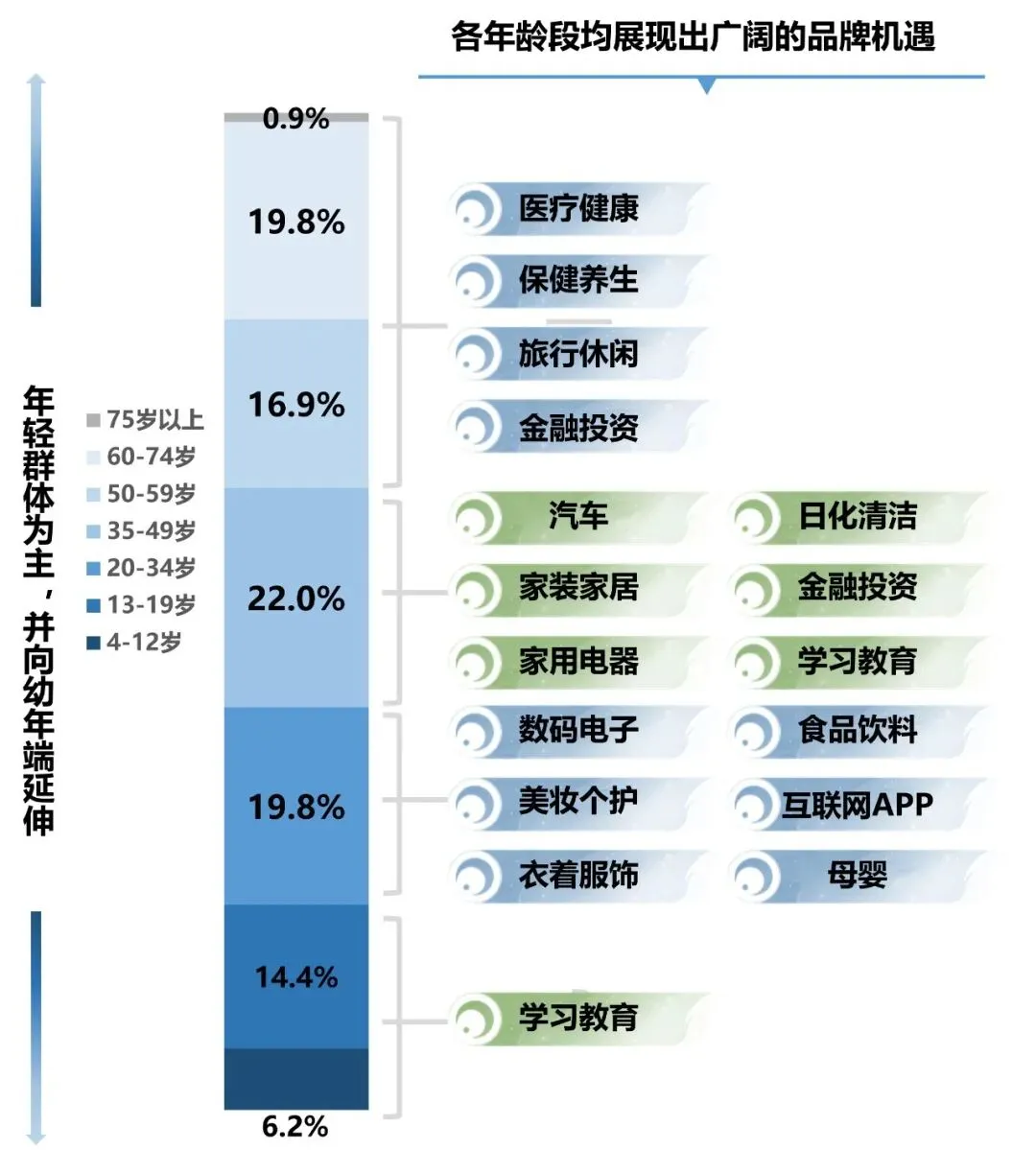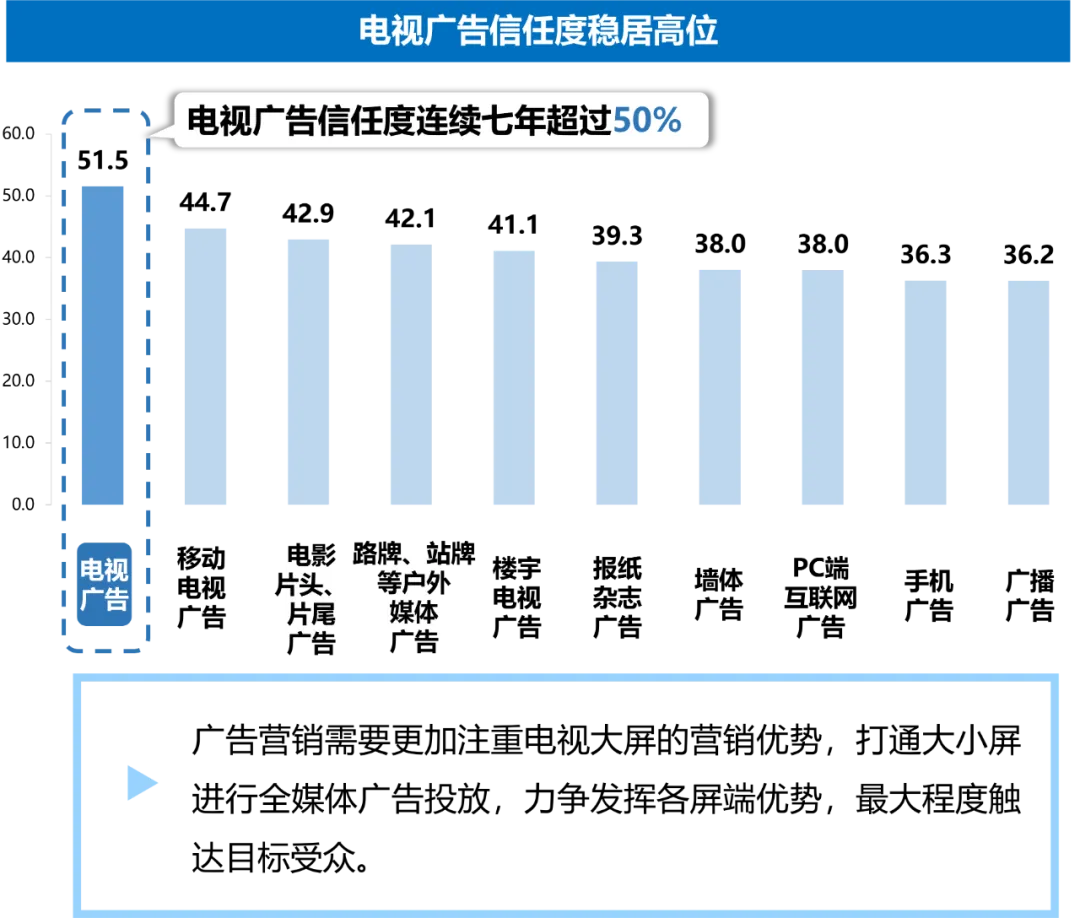 1. 电视大屏广告信任度稳居高位,为品牌提供强劲的公信力价值背书电视大屏以其深厚的用户基础与优质的内容资源对广告主形成持续且巨大的吸引力,而电视大屏广告以其丰富多样的广告形式和强大公信力价值实现受众注意力的留存,并帮助电视大屏广告完成价值转换。长期以来,电视大屏广告持续处在信任度高位。(注:媒介广告信任度指全国居民中“比较信任”与“信任”该类媒介广告的用户占比之和。)数据来源:美兰德·中国居民媒介接触习惯与生活消费形态调查数据库 Source:2022-2023.9@CMMR Co.,Ltd, 调查范围为全国31个省、直辖市、自治区,调查对象为调查范围内的常住人口,2023年调查样本量为12344人。2. 电视大屏建构起的家庭全龄段消费共识,为全品类营销赋能电视大屏作为家庭娱乐的中心,对各主要年龄段家庭成员均具有超强渗透力,为多品类广告主提供了广阔的表达场域。母婴、汽车、医药、美妆等针对不同年龄段家庭成员的品牌,均能在电视大屏端找到相匹配的营销空间和目标消费者群体,实现精准、有效的广告营销。数据来源:美兰德·中国居民媒介接触习惯与生活消费形态调查数据库 Source:2022-2023.9@CMMR Co.,Ltd, 调查范围为全国31个省、直辖市、自治区,调查对象为调查范围内的常住人口,2023年调查样本量为12344人。