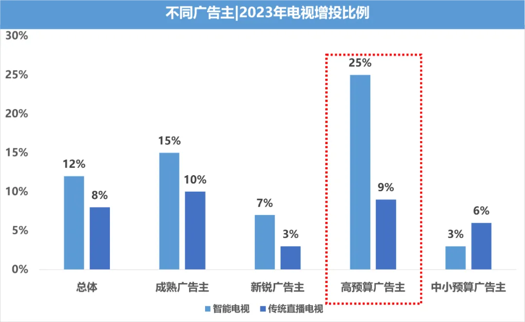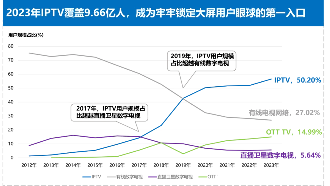 3. 智能电视大屏投放是广告营销的重要内容,是广大广告主青睐并信赖的投资沃土2023年广告主对智能电视大屏期待更高,总体上看,2023年广告主在智能电视大屏端增加投放的占比为12%,比传统直播电视增加投放的比例高4个百分点,其中高预算广告主在智能电视大屏增加投放比传统直播增加投放高近16个百分点,智能电视大屏广告效果认可度高于传统电视。(智能电视大屏指IPTV和OTT)2023年广告主对智能电视大屏、传统直播电视增加投放对比数据来源:秒针《2023中国数字营销趋势报告》(智能电视大屏指IPTV和OTT,传统直播电视指电视频道)智能电视大屏广告不仅拥有传统直播电视广告辐射广、公信力高等优点,还凭借流畅的交互、丰富的功能、高质量的自制节目从而具有更值得深挖的潜力,在当下竞争激烈的市场中被各大广告主视为可以破局的关键。1. IPTV覆盖人口近10亿,多元优势推升流量价值近年来,在丰富资源、多元内容、强大功能及政策护航的加持下,IPTV市场发展迅速,用户规模连年攀升,构建了最具发展实力与潜力的智慧大屏形态。(注:本报告中单位“人”为“人数”,非“人次”概念。以下同。IPTV覆盖总人口为所有拥有IPTV接收设备的家庭总人口,常用用户规模占比为最常使用IPTV或其他方式收看电视的人口占总人口的比例。)