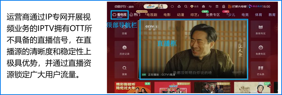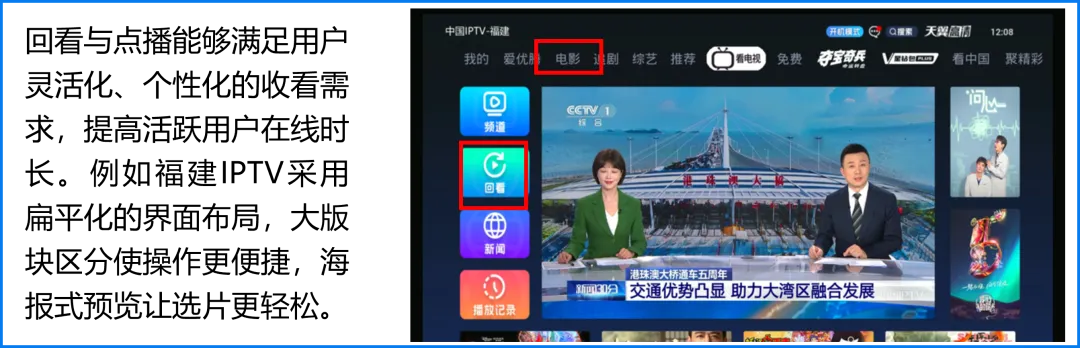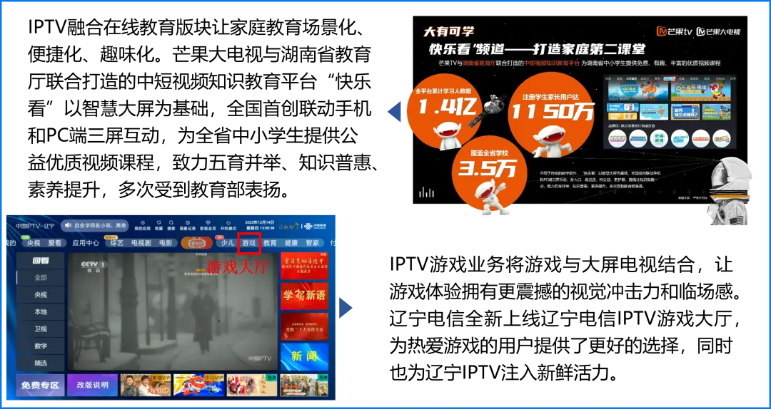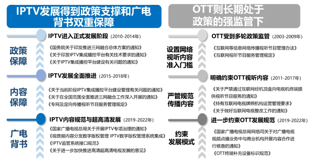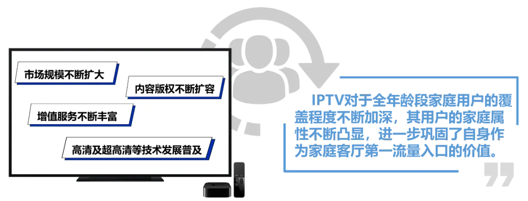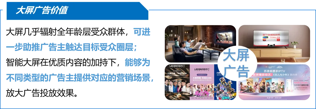 2. IPTV以最丰富成熟的服务功能打开最广阔的大屏营销空间IPTV不仅拥有直播及回看功能,同样拥有视频点播、生活服务、线上娱乐等众多增值服务功能,用户也已养成较为成熟的增值服务使用习惯。IPTV通过开设特色板块,实现媒体宣推价值、满足用户多元视听需求的同时能够实现广告和内容的精准投放,提高广告的精准度和转化率。特色板块聚焦不同赛道,为各品类品牌营销提供良好的生态环境。3. 政策保驾护航推动IPTV成为最具发展实力与潜力的大屏形态以运营商与播控牌照商为运营主体的IPTV,其天然具有政策护航和广电背书的双重保障机制。IPTV明显的政策支持优势与官方背书资源,极具安全、稳定、长远的发展前景。