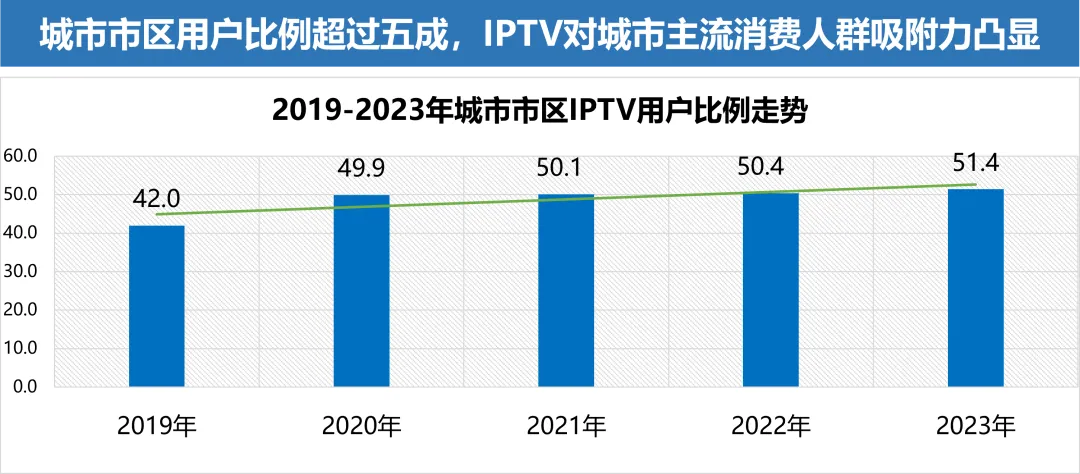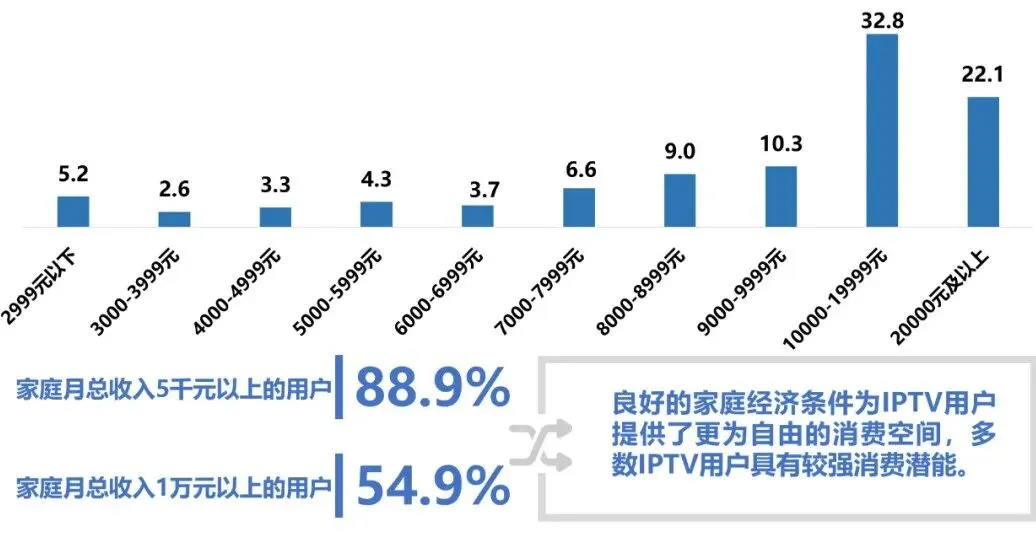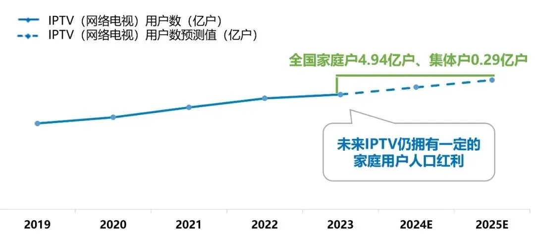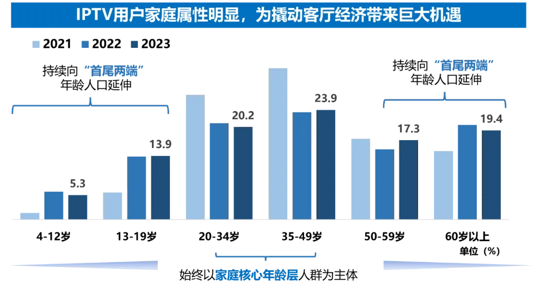 在政策支持以及市场环境趋好的背景下,未来IPTV在家庭客厅娱乐市场中的地位仍将无法撼动,在5G+8K等技术的加持下,未来IPTV将进一步探索大屏与智慧家庭场景融合、客厅经济发展的新可能。(注:本图数据根据工信部官网发布的2019-2023年通信业经济运行情况进行预测分析。)1. IPTV深度锁定核心家庭用户,拥有强劲的家庭消费激活能力IPTV始终以家庭全龄段用户为核心。当前IPTV用户结构基本稳定,始终以20-49岁的社会及家庭核心年龄层人群为用户主体,较整体电视观众高出2.3个百分点,并持续向“首尾两端”年龄人口延伸,增加了对于高龄、低龄段用户的覆盖,不断拓展各类家庭成员的覆盖范围。数据来源:美兰德·中国居民媒介接触习惯与生活消费形态调查数据库 Source:2022-2023.9@CMMR Co.,Ltd, 调查范围为全国31个省、直辖市、自治区,调查对象为调查范围内的常住人口,2023年调查样本量为12344人。