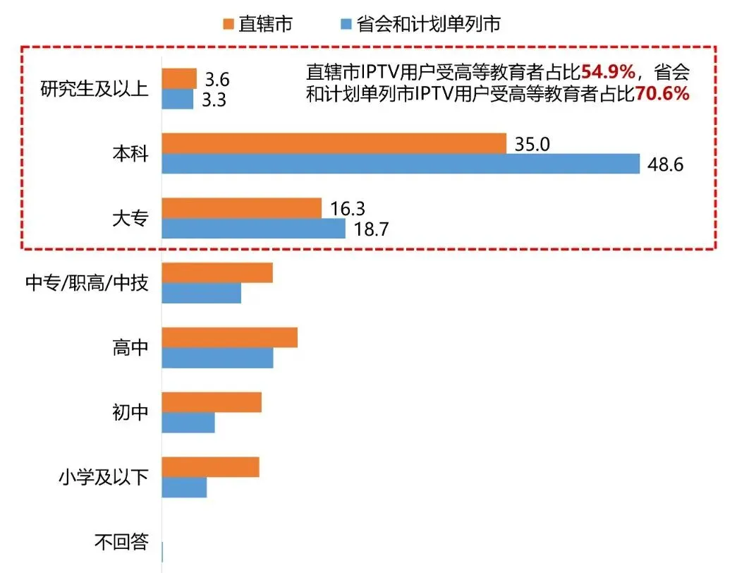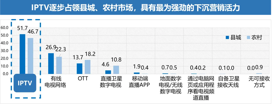 2. IPTV全面撬动一、二线城市与“下沉市场”,展现强劲全域营销活力当前IPTV已实现与不同圈层用户的全方位对接,撬动了全域主流人群消费潜力。其中,近年来IPTV在城市地区覆盖状况良好,城市市区用户逐年增加。2019-2023年各类接收方式中IPTV城市市区用户比例分布(%)IPTV在直辖市、省会和计划单列市的用户均主要集中在公司职员及高等文化群体中,反映了其对城市中主流消费群体的巨大吸引力。2023年直辖市、省会和计划单列市IPTV用户学历水平分布(%)2023年直辖市、省会和计划单列市IPTV用户职业分布(%)近年来各省IPTV积极响应乡村振兴战略,开发相关内容、推出便民服务等,塑造了在城乡地区的优秀品牌形象,为IPTV在下沉市场的营销“破局”带来机遇。2023年农村和县城地区各类接收方式用户比例分布(%)数据来源:美兰德·中国居民媒介接触习惯与生活消费形态调查数据库 Source:2022-2023.9@CMMR Co.,Ltd, 调查范围为全国31个省、直辖市、自治区,调查对象为调查范围内的常住人口,2023年调查样本量为12344人。