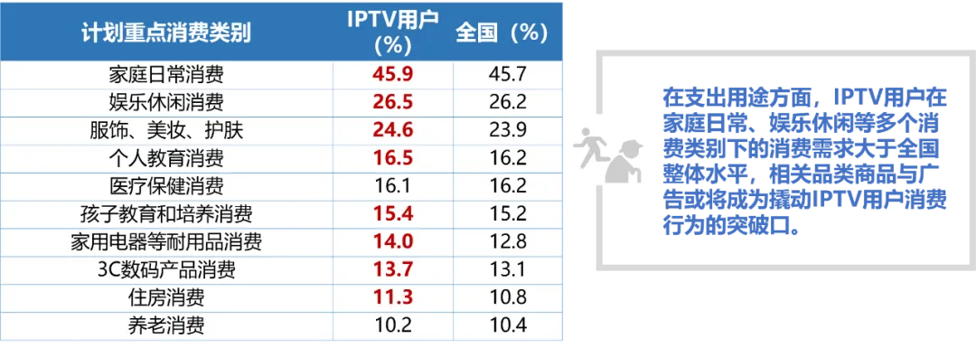 3. IPTV用户消费观念成熟、刚需消费不断升级,是品牌营销的待掘富矿作为客厅娱乐的终端与家庭流量的入口,IPTV广泛影响着中国家庭用户。但在“上有老下有小”的生活压力下,IPTV用户家庭收入虽处于高位,消费行为却相对理性,刚性消费需求旺盛,消费潜能亟待挖掘。2023未来半年中IPTV用户和全国居民支出用途选择对比数据来源:美兰德·中国居民媒介接触习惯与生活消费形态调查数据库 Source:2022-2023.9@CMMR Co.,Ltd, 调查范围为全国31个省、直辖市、自治区,调查对象为调查范围内的常住人口,2023年调查样本量为12344人。