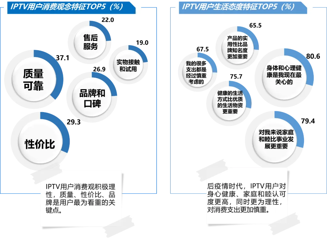 IPTV用户消费观积极理性,挖掘消费痛点将为IPTV营销带来突破。IPTV用户消费观积极理性,更加看重商品的质量、性价比以及品牌和口碑。同时IPTV用户也更加认可身心健康与家庭和睦的重要性,消费更为谨慎,对花费与支出会慎重考虑。IPTV用户生活态度特征TOP5及消费观念特征TOP5 (注:两题均为多选。)数据来源:美兰德·中国居民媒介接触习惯与生活消费形态调查数据库 Source:2022-2023.9@CMMR Co.,Ltd, 调查范围为全国31个省、直辖市、自治区,调查对象为调查范围内的常住人口,2023年调查样本量为12344人。未来广告主或可依托IPTV用户消费习惯适配品牌特性,如重点关注健康、养生的IPTV用户会乐于关注该类型的全新品牌,围绕产品的实际用途、产品功能、性价比及产品性能等进行细致阐述,结合IPTV特色内容更容易戳中IPTV用户关注生活品质的消费痛点。当前各省、市、自治区因不同的政策、经济发展水平、网络基础设施、用户需求等因素影响,IPTV业务的发展存在一定差异。各省IPTV“各自为政”会导致资源分散,缺乏统一的品牌战略,从而难以形成合力。在这种情况下,全国性的品牌营销更为复杂,难以形成规模效应。在开放、合作、共享发展大趋势下,大屏聚宝盆通过整合全国31省市IPTV的渠道资源,在避免跨省重复投放、降低广告运营成本、打破单一投放局限等方面进行了有益尝试,打造智能电视渠道最大的广告流量汇聚平台。作为中国融合传播与融合营销领域的探索者及践行者,权威传播咨询机构美兰德全面聚合传播渠道、海量内容、企业品牌、全域用户四大领域分析研究体系,致力于用融合传播与融合营销先进研究成果与技术应用帮助政府、媒体、企业实现品牌塑造与战略升级、消费者洞察与连接、营销赋能与经营业绩持续改善,以数据与咨询的力量帮助客户成功,共创未来。目前美兰德已服务数百家政府部委及知名学术单位、媒体机构与国内外品牌企业。