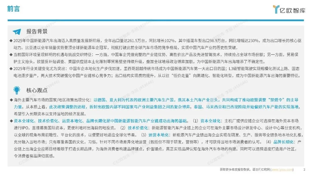 1. 出海新范式:中国新能源智能汽车产业链出海正从“低价走量”向“高端化、智能化”转型,形成了资本全球化、技术价值化、运营本地化、品牌长期化的出海新范式。