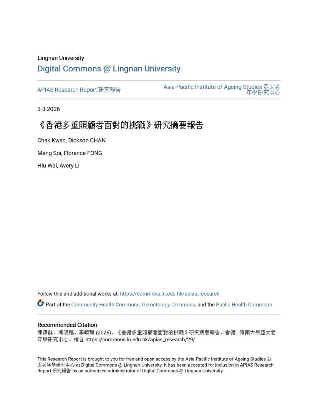 多重照顧者是香港長期照顧體系中極為關鍵的群組,卻長期缺乏制度性支援。他們在時間、角色、心理與經濟上承受巨大壓力,影響身心健康與家庭功能。研究建議政府與相關機構從制度設計、政策調整及資源整合方面著手,建立更完善的支援系統,以提升照顧者福祉,並維持社會照顧網絡的可持續性。