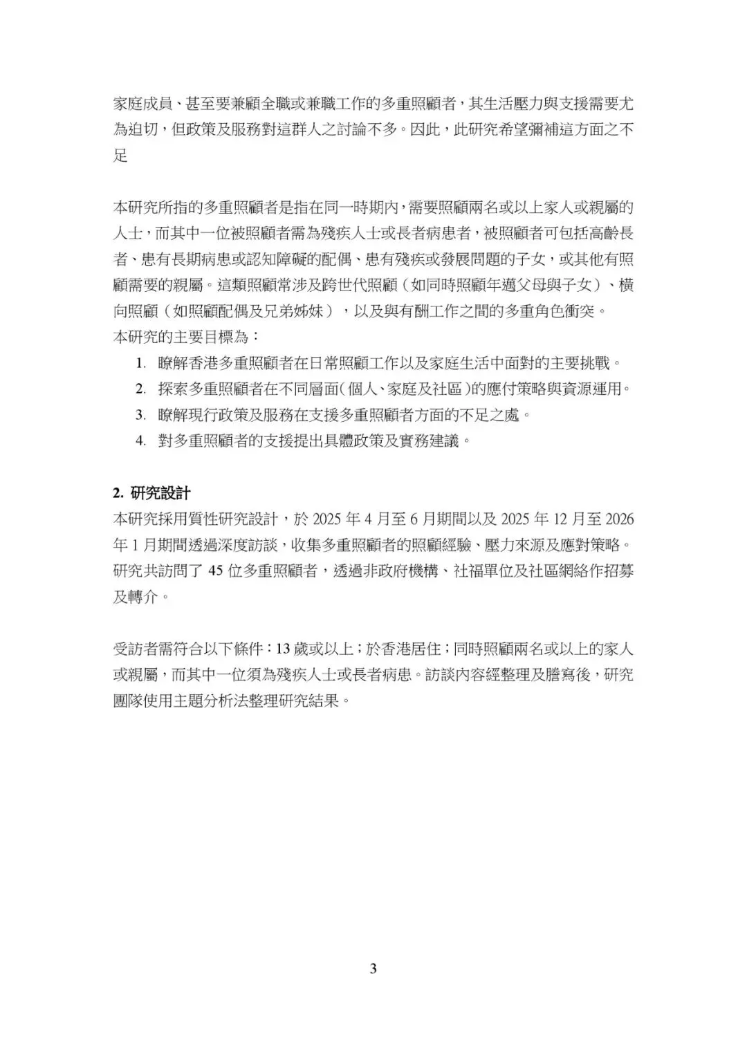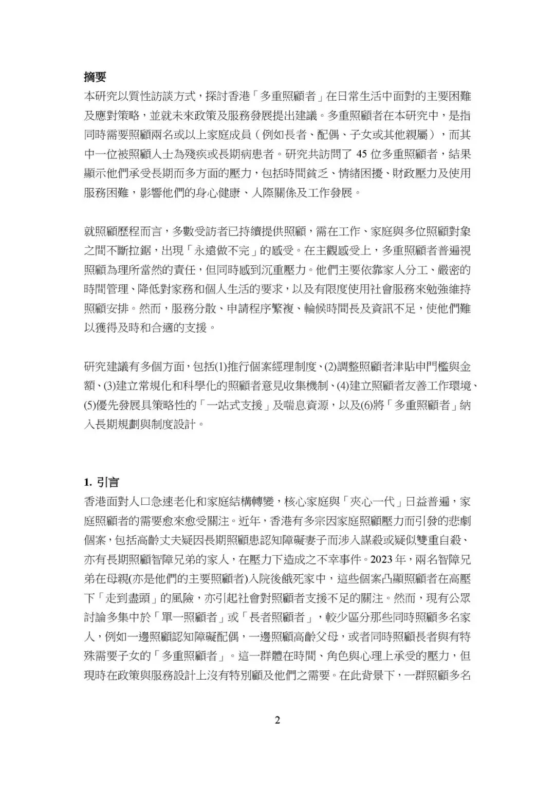 本研究探討香港多重照顧者在日常生活中所面臨的多重壓力與支援需求,通過質性訪談方式,訪問了45位多重照顧者。研究顯示,多重照顧者需同時照顧兩名或以上家庭成員,其中至少一人為殘疾或長期病患者。他們在時間、角色、心理及經濟方面承受巨大壓力,並面臨尋求社會服務的困難。