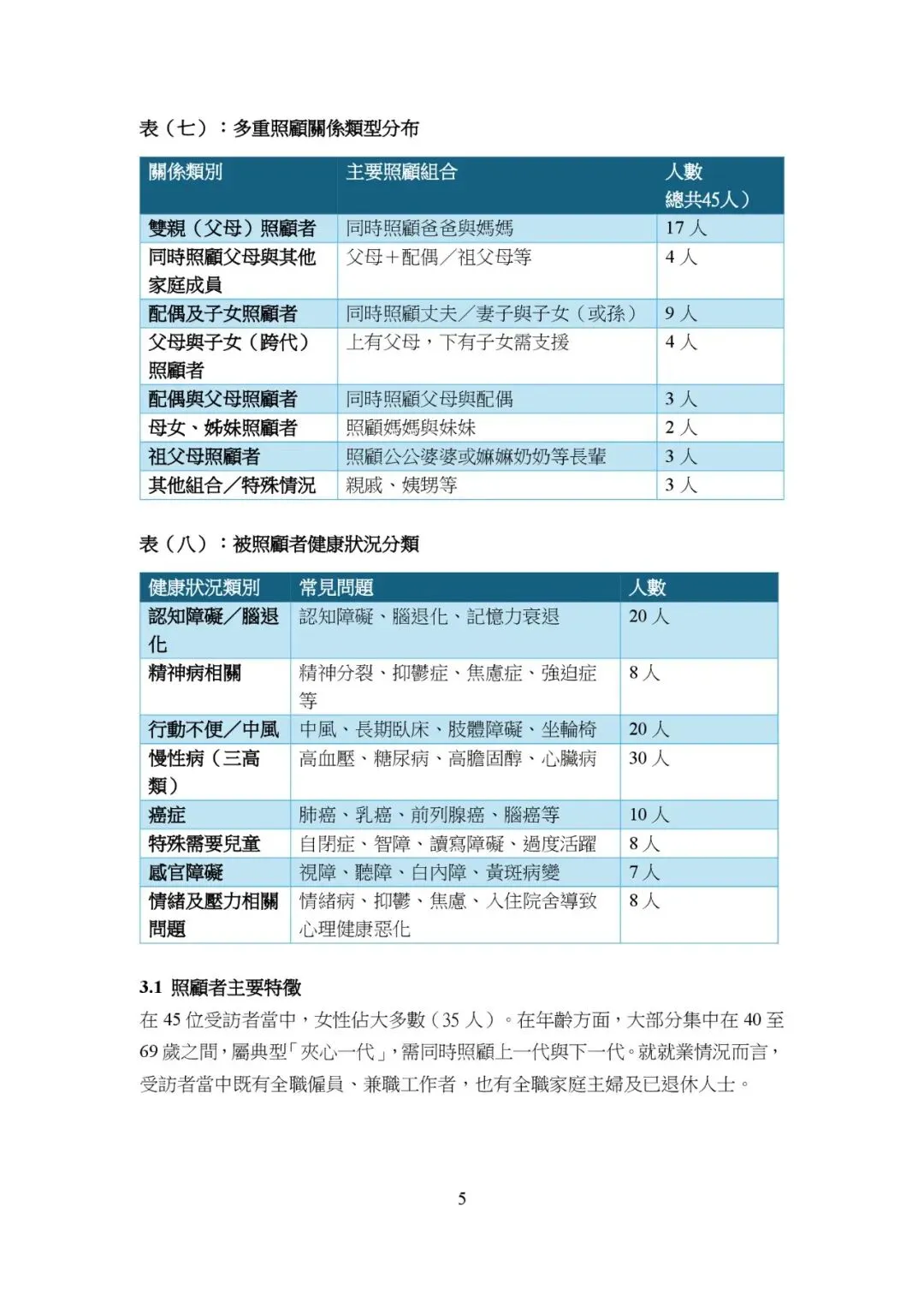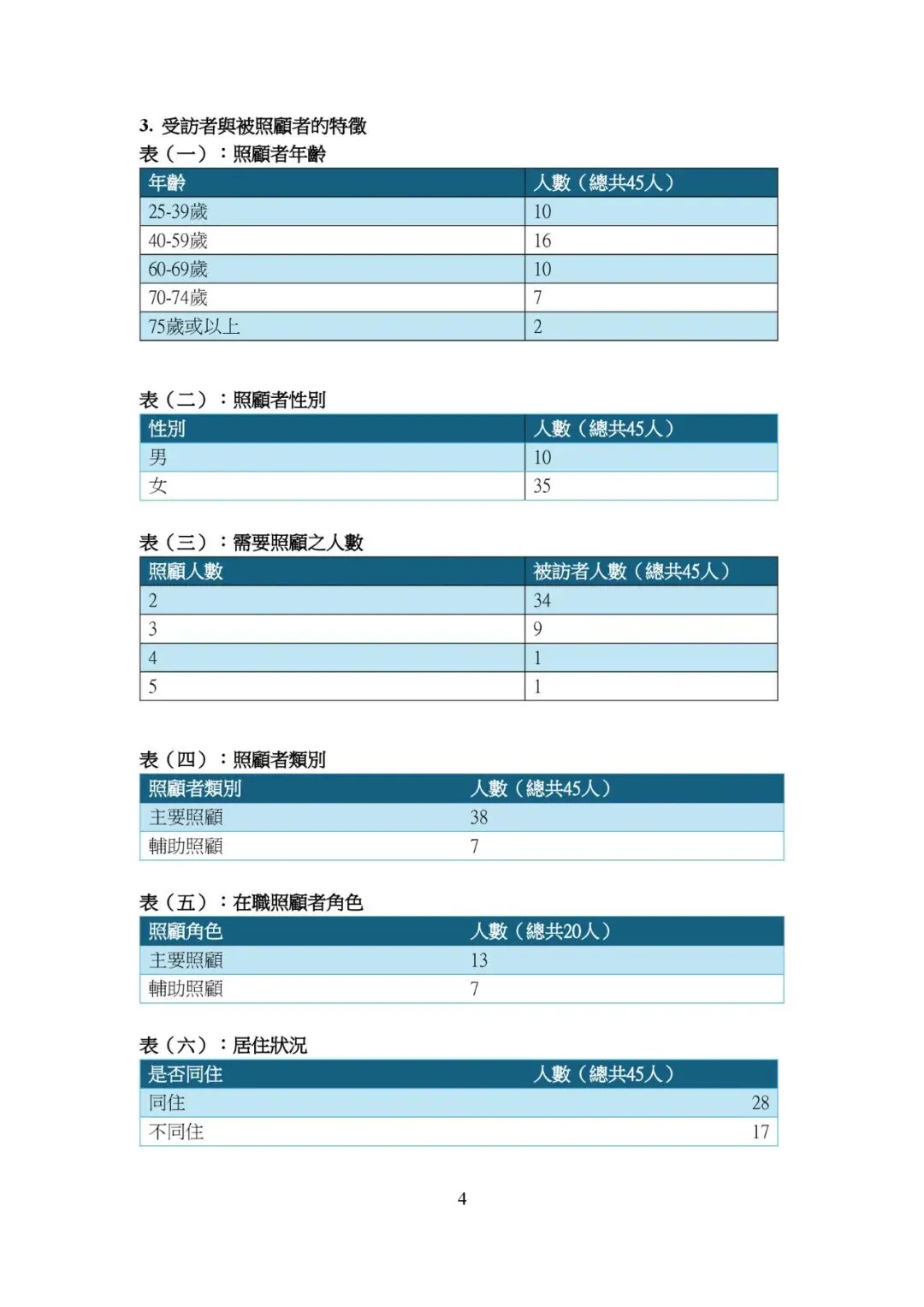 | 照顧關係類型 | 45人 | 雙親照顧者:17人;父母+其他家庭成員:4人;配偶及子女照顧者:9人;父母與子女照顧者:4人;配偶與父母照顧者:3人;母女、姊妹照顧者:2人;祖父母照顧者:3人;其他組合:3人 |