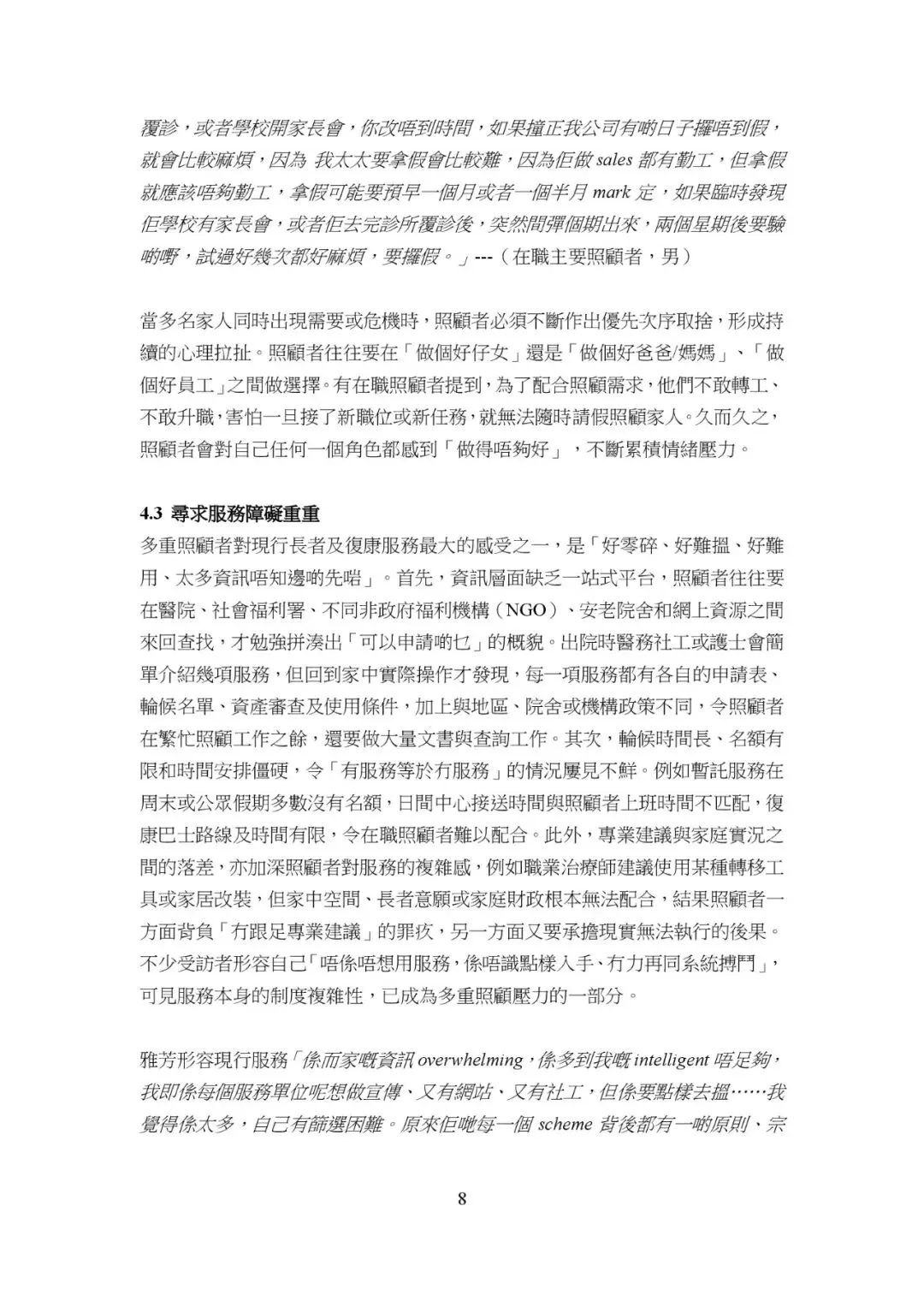 - 有僱主不理解照顧者需求,造成工作壓力。