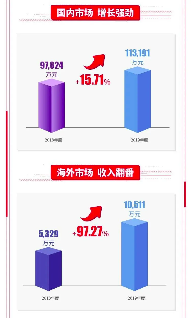威胜信息的年报显示,威胜信息2019年实现营业收入12.44亿元,同比增长19.78%,三年的复合增长率达到11.81%;归属于上市公司股东净利润2.17亿,同比增长22.77%,三年的复合增长率达到20.89%。2019年全年,威胜信息综合毛利率达到了34.05%,在2018年的基础上又提升了1.37个百分点。去年,公司境内外收入都呈增长态势。报告期内,公司境内收入达11.32亿元,同比增长15.71%,占收入比91.5%;得益于紧跟“一带一路”政策及公司海外拓展战略初见成效,海外市场实现收入1.05亿元,同比增长97.24%,收入占比8.5%。
