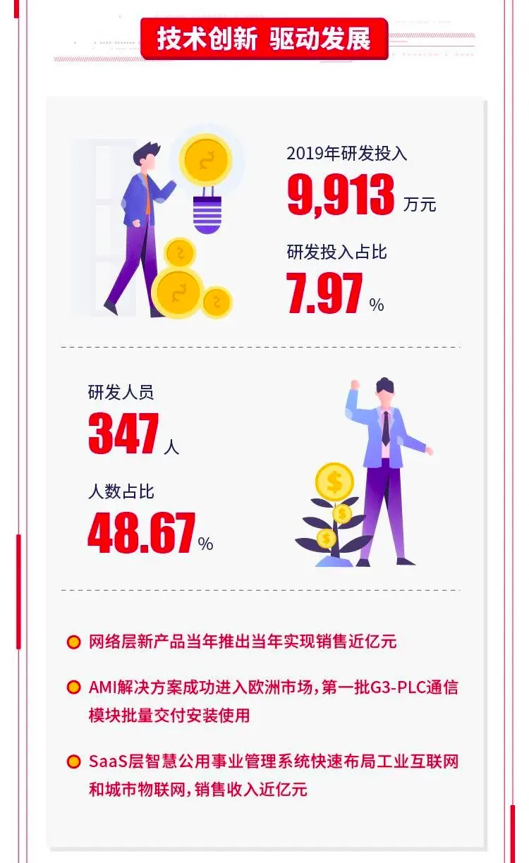 具体来看,去年公司三个层级收入均实现同比增长,其中感知层实现收入4.17亿元,同比增长32.25%;网络层实现收入7.26亿元,同比增长14.14%;应用层实现收入9420万元,同比增长17.38%。与此同时,公司还披露了2020年一季报,尽管受到新冠疫情影响,但其营收和净利润依然维持正增长。其中,营业收入达到2.39亿元人民币,同比增长4.71%;归母净利润达到3271万元,同比增长16.49%;每股收益同比增长16.67%至0.07元。威胜信息表示,企业影响力的增强离不开创新研发的不断投入。去年,威胜信息的研发投入达到了9913万元,占营业收入比重8%。