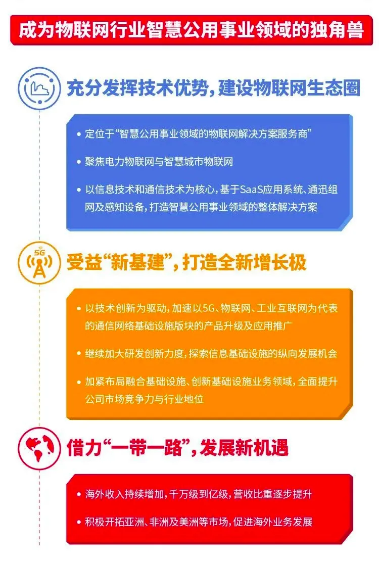 公司将抓住“新基建”、物联网发展的历史机遇,聚焦电力物联网与智慧城市物联网,以信息技术和通信技术为核心,基于SaaS应用系统、通信组网及感知设备,打造物联网整体解决方案。放眼未来,公司将继续深耕国内市场,密切关注“新基建”建设步伐,充分发挥自身信息技术和通信技术优势,从信息基础设施、融合基础设施及创新技术设施三个方面全面发展,并带动市场份额持续增长。同时威胜信息将积极拓展海外市场,主要面向亚洲、非洲和美洲市场,跟随“一带一路”共同发展倡议,重点布局沿线经济活跃、人口基数大和发展潜力强的国家和地区,聚焦电力AMI、智慧水务和智慧燃气产业方向,以解决方案为核心,充分发挥在电力通信(载波、无线、公网)和水气通信(LoRaWAN、NB-IoT)以及系统应用方面的技术优势,实现海外营收快速增长。*以上内容不构成投资建议,不代表华尔街见闻观点,请独立判断和决策。