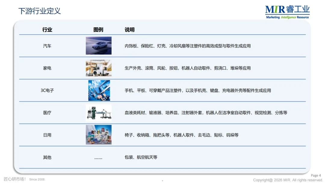 下游应用方面,注塑直角坐标机器人主要服务于汽车(32%)、家电(22%)、3C电子(12%)、日用(10%)等行业。其中汽车领域占比持续提升,2025年预计达33%,显示出汽车零部件注塑自动化的强劲需求。