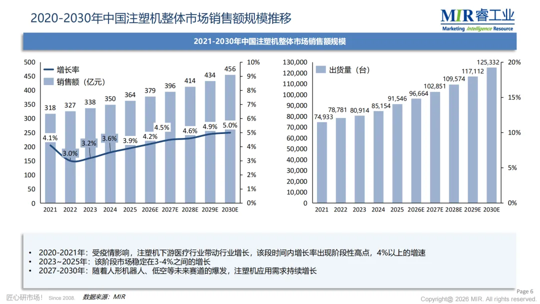 报告显示,2021至2030年间,中国注塑机市场整体呈现稳步增长态势。2020-2021年受疫情影响,医疗耗材需求激增,行业迎来阶段性高点。2023-2025年市场进入平稳增长期,年增速维持在3%-4%之间。值得关注的是,2027-2030年,随着人形机器人、低空经济等新兴赛道的爆发,注塑机应用需求有望迎来新一轮增长。