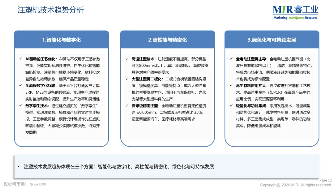 报告在多个章节中提炼出注塑机器人技术的三大发展方向: