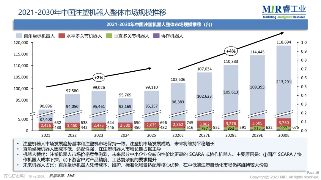 注塑机器人市场同样呈现稳健增长态势。以直角坐标机器人为例,2021-2030年出货量年复合增速约11%,营收年复合增速约9%。随着国产SCARA和协作机器人成本下降,未来部分中小企业将转向性价比更高的替代方案,但直角坐标机器人仍将在中低端市场维持较大份额。