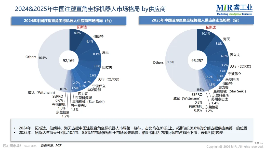 总体来看,中国注塑行业机器人市场正处于从“自动化”向“智能化”跃迁的关键阶段。在汽车、3C、医疗等下游需求驱动下,机器人企业正加速技术升级与产品迭代。头部企业凭借规模优势、渠道网络和服务能力构建起护城河,而差异化定位、区域深耕、方案捆绑等策略则成为中小玩家突围的关键。