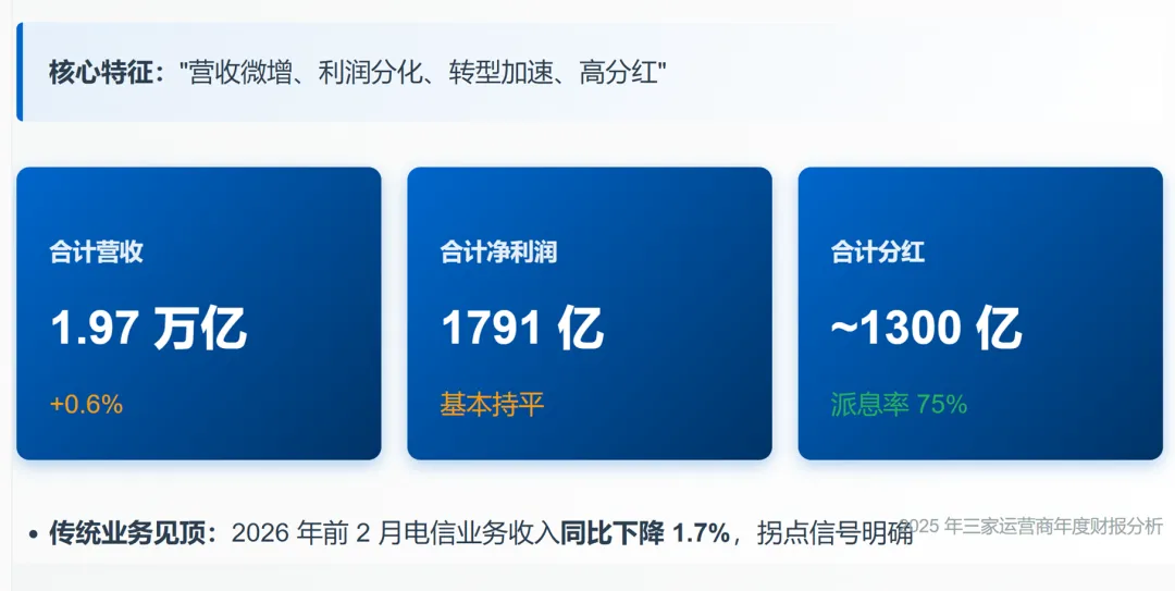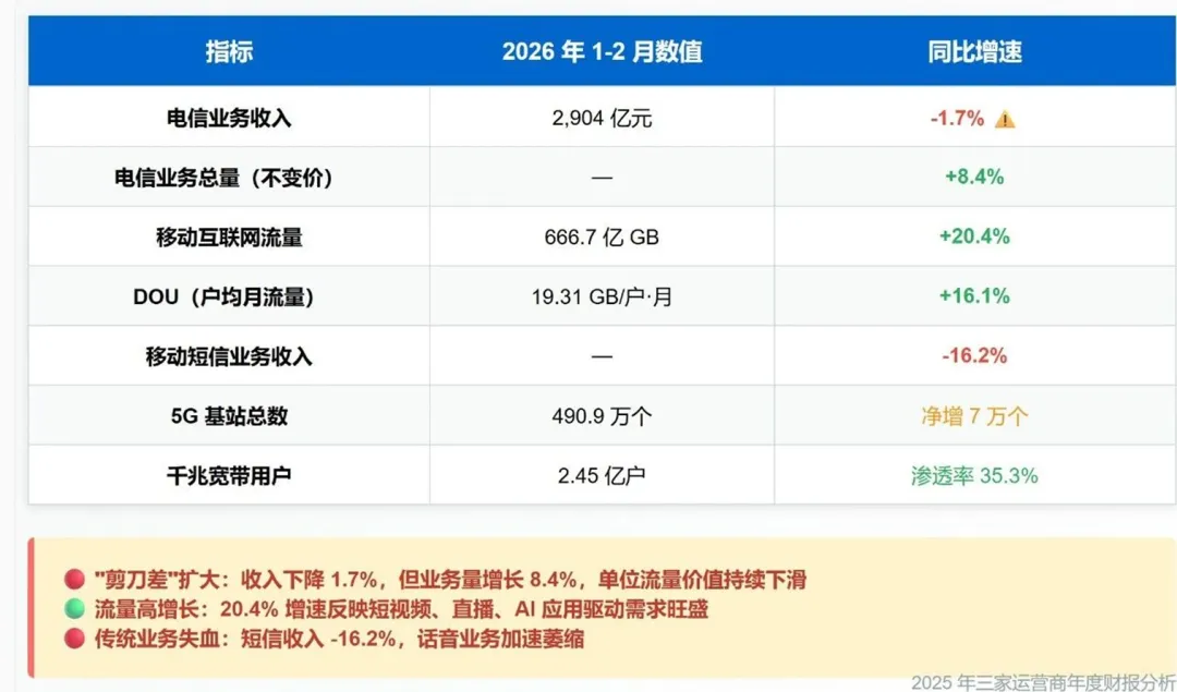 工信部发布的2026年1-2月通信业经济运行情况,为上述财报趋势提供了有力印证,并揭示了转型的压力与迫切性。
