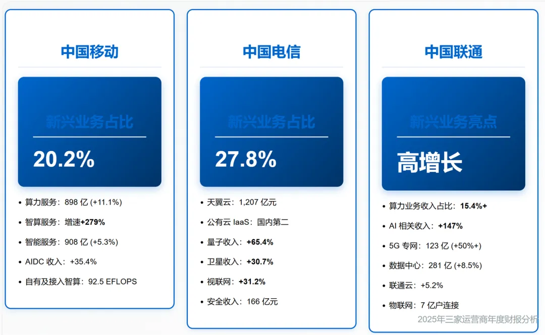 三家运营商陆续发布了2025年的年报,可以总结为“平稳增长承压,新兴业务担纲增长引擎”。