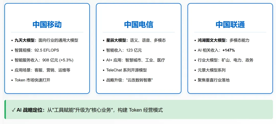 综合来看,2025年的三大运营商的财报是一次清晰的“新旧动能转换”宣言。传统通信服务的“管道化”困境日益加深,简单的用户规模扩张已无法带来有效增长,ARPU值下滑是普遍问题。以智算为核心的算力服务、以行业AI应用为代表的智能服务以及以天翼云/联通云为代表的公有云业务,已成为驱动增长的“新三驾马车”。在资本开支层面,算力投资已是唯一的“增长线”,这标志着未来竞争的主战场已从“连接”全面转向“计算”和“智能”。商业模式正经历从“流量”到“Token”的根本性转变。未来运营商的竞争力,将体现在其提供高效、廉价、智能的AI计算服务(Token)的能力上。