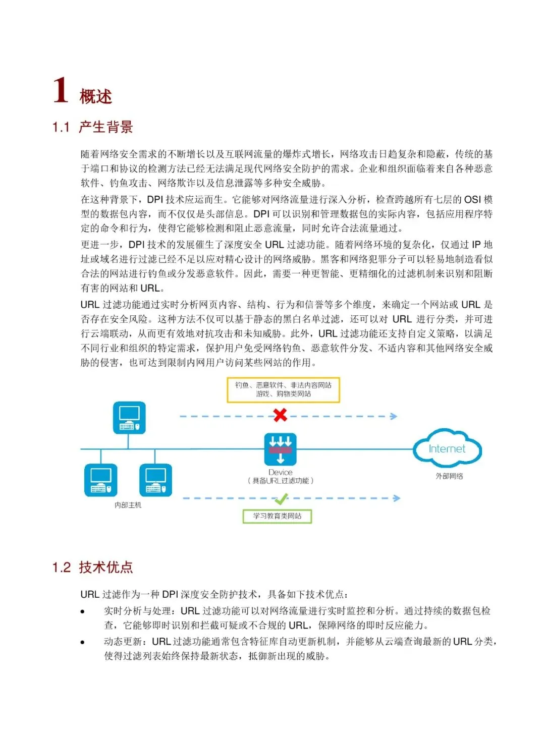 URL 过滤是一种基于深度包检测(DPI)技术的网络安全防护手段,用于识别和管理网络流量中的 URL,以实现对网络访问行为的控制和安全防护。该技术通过分析 URL 的内容、结构、行为和信誉等多个维度,判断其是否安全,从而决定是否允许访问或拦截该 URL。