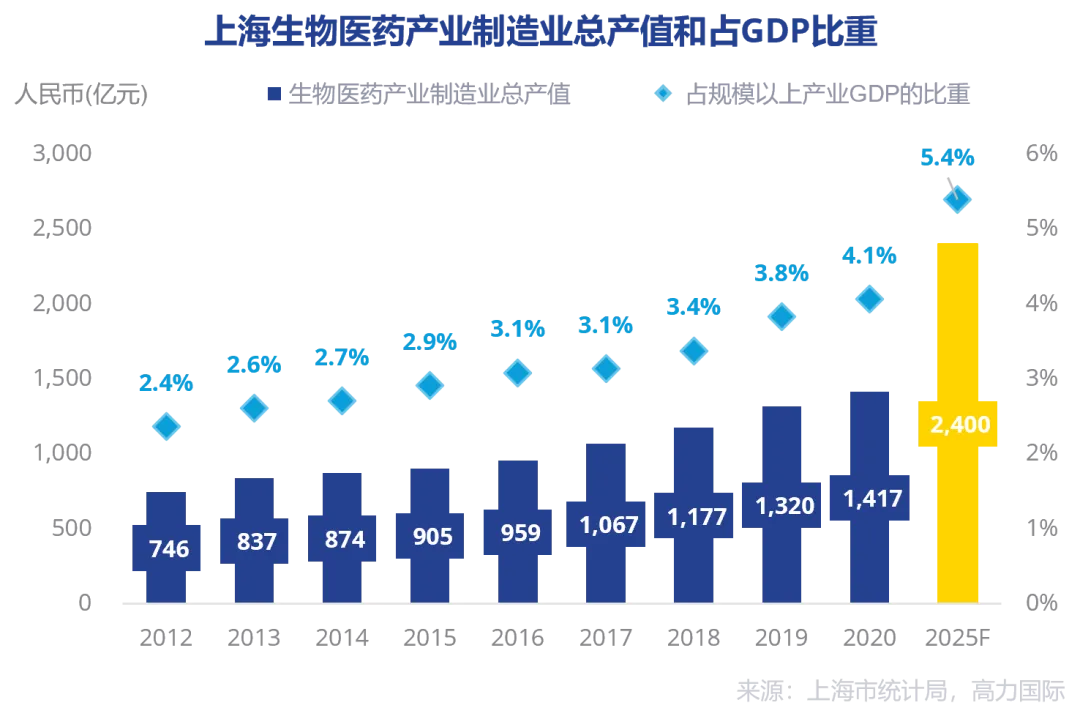 生物医药产业是上海市九大战略性新兴产业之一,也是上海重点发展的三大先导产业之一。2018-2020年,上海生物医药产业制造业的生产总值保持着10%的复合增速、占GDP比重持续攀升;上海市“十四五”也明确了生物医药产业制造业产值至2025年达到人民币2,400亿的近期发展目标,前景十分广阔。