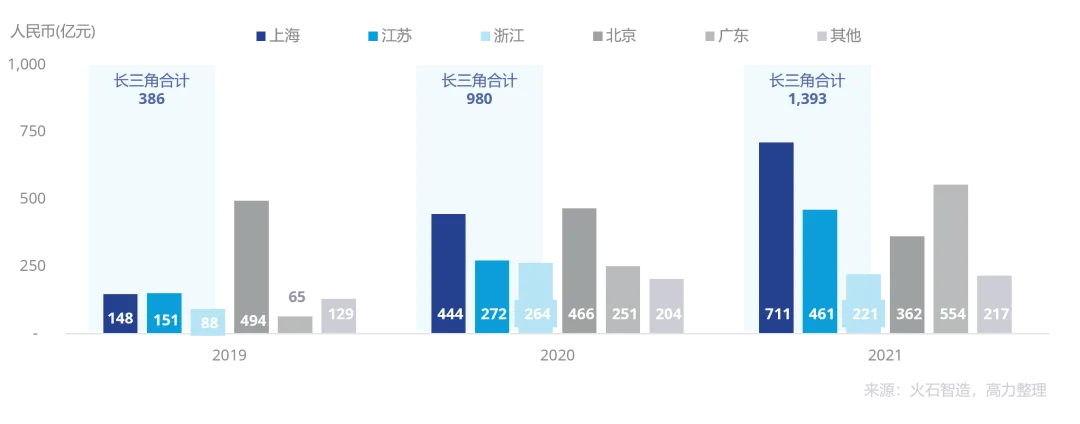 从融资的角度看,上海的生物医药产业具有极强的成长性。上海生物医药融资规模在过去三年翻了将近五倍,成为生物医药领域融资规模最大的城市。长三角区域的融资规模过往三年激增三倍,占全国的百分比由2019年的36%提升至2021年末的55%。